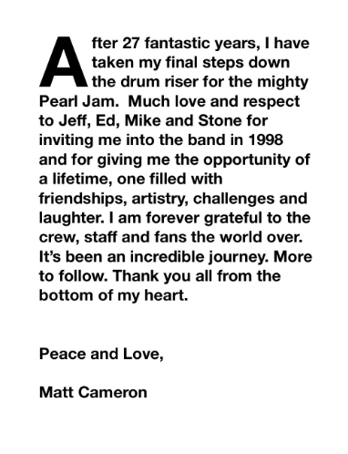 펄 잼의 드러머 맷 캐머런이 27년간의 긴 여정을 마치고 밴드를 떠난다는 소식이 전해졌다. 7월 7일 자신의 인스타그램에 밴드 하차소식을 밝힌 캐머런의 다음 행보는 미지수이다.
