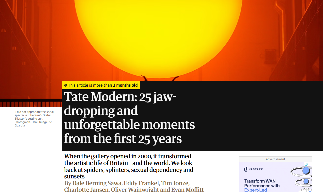 영국의 가디언이 흥미로운 기사를 냈다. 테이트모던의 25주기를 맞아 굵직한 전시 또는 사건 25개를 선정한 것이다. 익히 들어봤음직한 유명 아티스트들의 전시이기 때문에 친숙하기도 해서 공유한다.